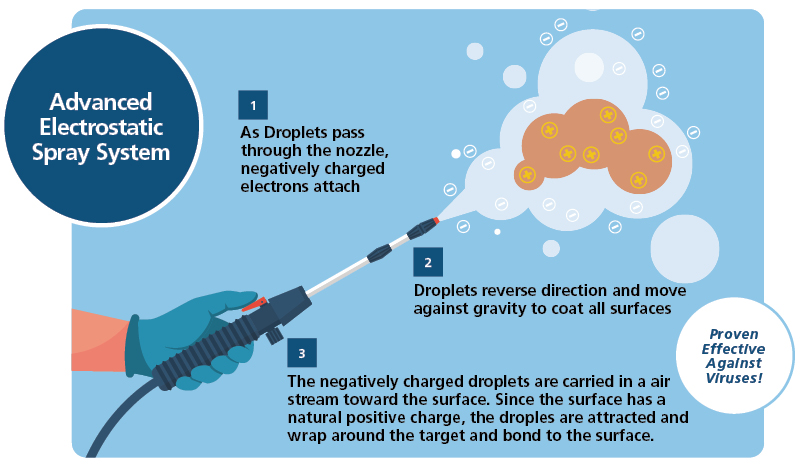 The process we use is a “no touch” infection control technology that is exactly like no other. Our system electrostatically charges the BactroKill disinfectant, which is proprietary stabilized chlorine dioxide, so that the BactroKill effectively coats virtually the entire surface area of application. It is extremely more effective than gravity applied disinfectants.